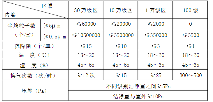 表1 潔凈區(qū)環(huán)境控制標準