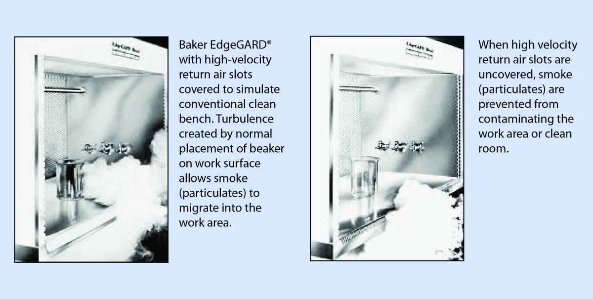 當一個燒杯放置常規層流凈化臺的氣流中(示出,EdgeGARD®與覆蓋回風槽),所得到的氣流中斷產生煙霧的回流進入工作區。